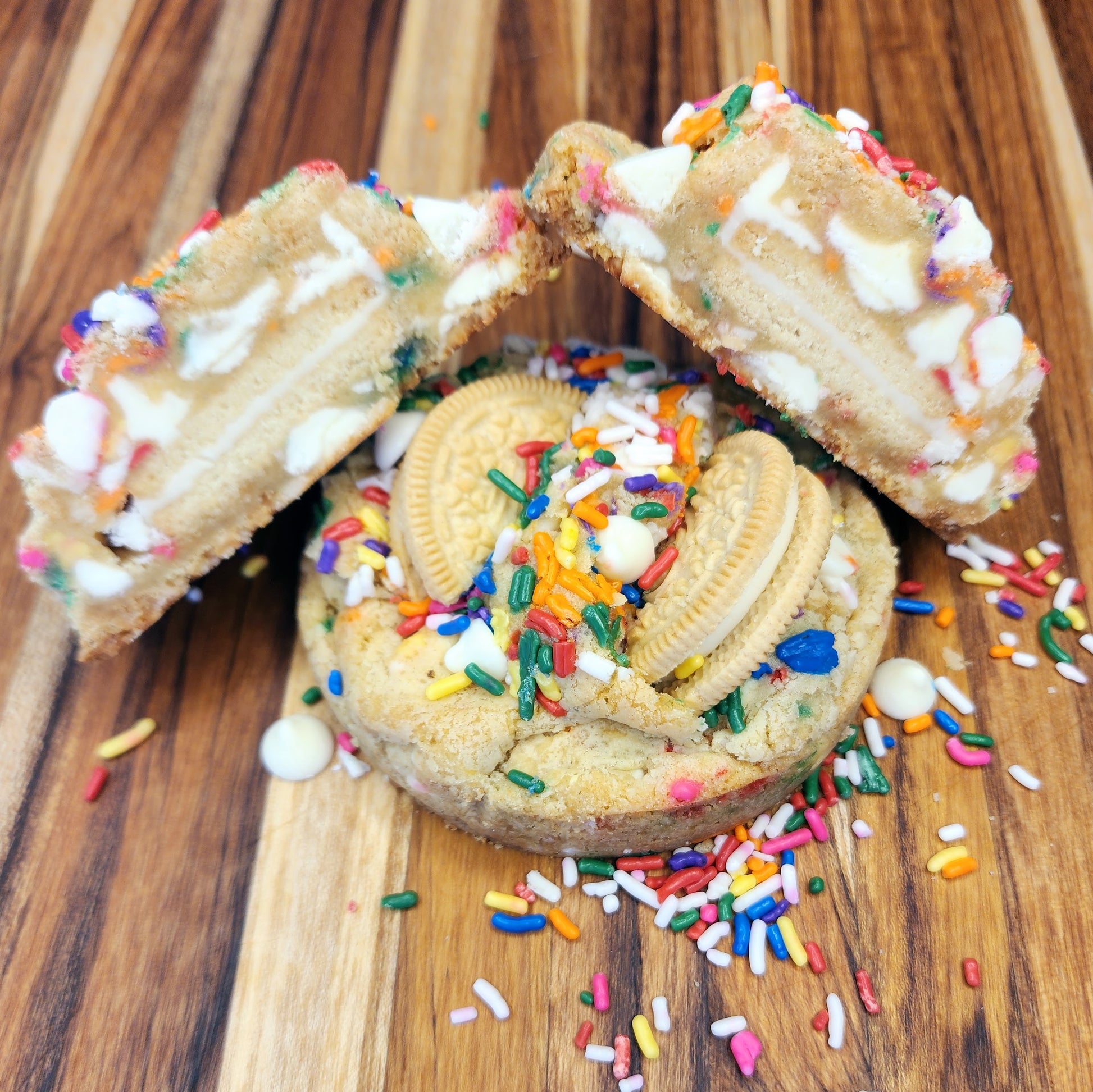 Golden Oreo cookie dough loaded with premium white chocolate chips and crushed Golden Oreo cookies, then stuffed with a whole Golden Oreo cookie and topped with sprinkles and another Golden Oreo cookie. 6.0 oz