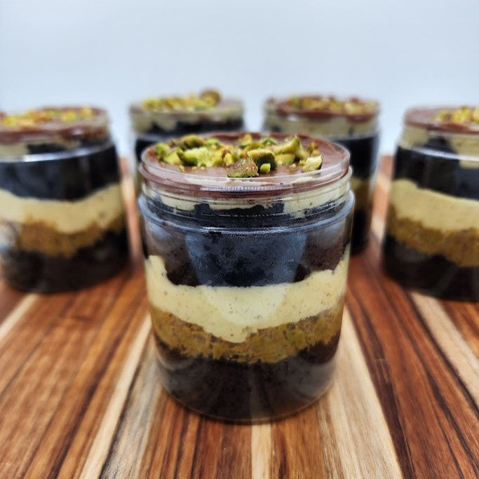Devil's food cake layered with homemade pistachio kataifi filling and pistachio buttercream. 6.0 oz
