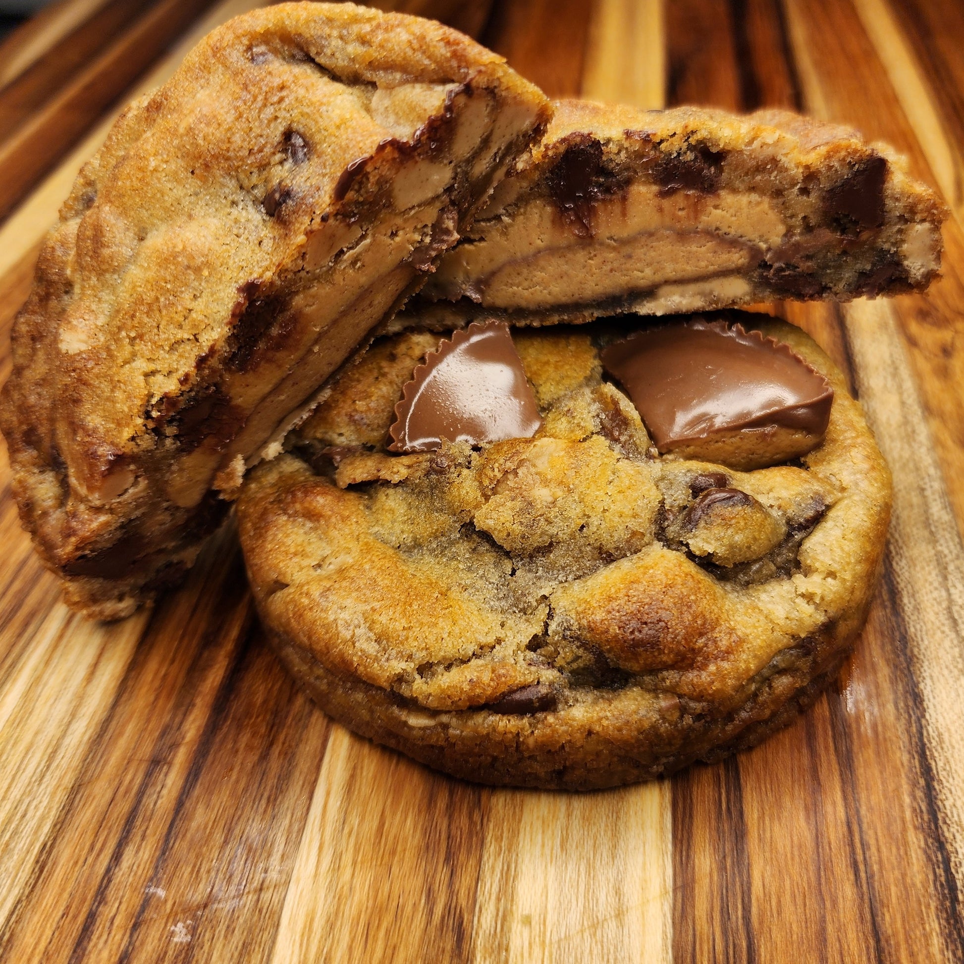 Our Main Street cookie dough loaded with premium chocolate chips and Reese's peanut butter chips, then stuffed with a full-size Reese’s Peanut Butter Cup and topped with Reese's Pieces. 6.3 oz